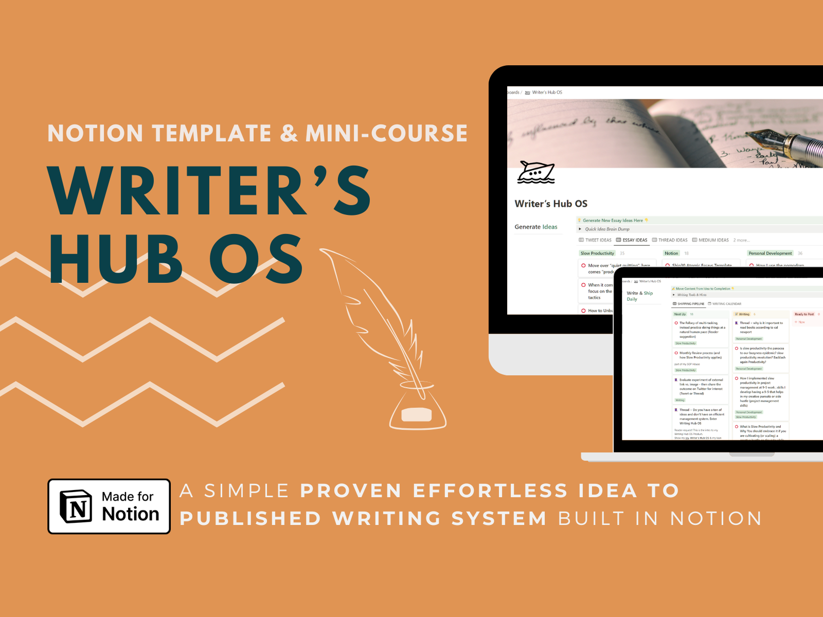 A simple proven writing system built in Notion for coaches, solopreneurs and content creators. Helping you go from idea capture through to hitting published, so you'll hit publish on your worse day, not just your best. âĄHow will this help you? Start using a Done-For-You Writerâs Hub OS Notion template in Notion, without the learning curve. (with accompanying how-to video)Track and organise your writing and content creation ideas all in one place.Reduce stress and overwhelm as a new online writer & creator (especially if you have a day job or busy life).A system to track everything you publish to all your platforms (e.g. Newsletter, Twitter content, blog posts, LinkedIn posts)Quickly and easily capture content ideas into your Library of Content, so youâre never left wondering where you should store something or lose an idea. âĄWhat Youâll Learn? Implement the Writerâs Hub OS writing system in your Notion workspace.The common mistakes Notion beginners make (and how to avoid them).The Notion best practices to get started in Notion in less time and with less overwhelm as a beginner.How to structure and design pages in Notion so that itâs simple, functional and low maintenance, using my simple 1-workflow-1-dashboard framework to build anything in Notion (Not just your Writerâs Hub OS).